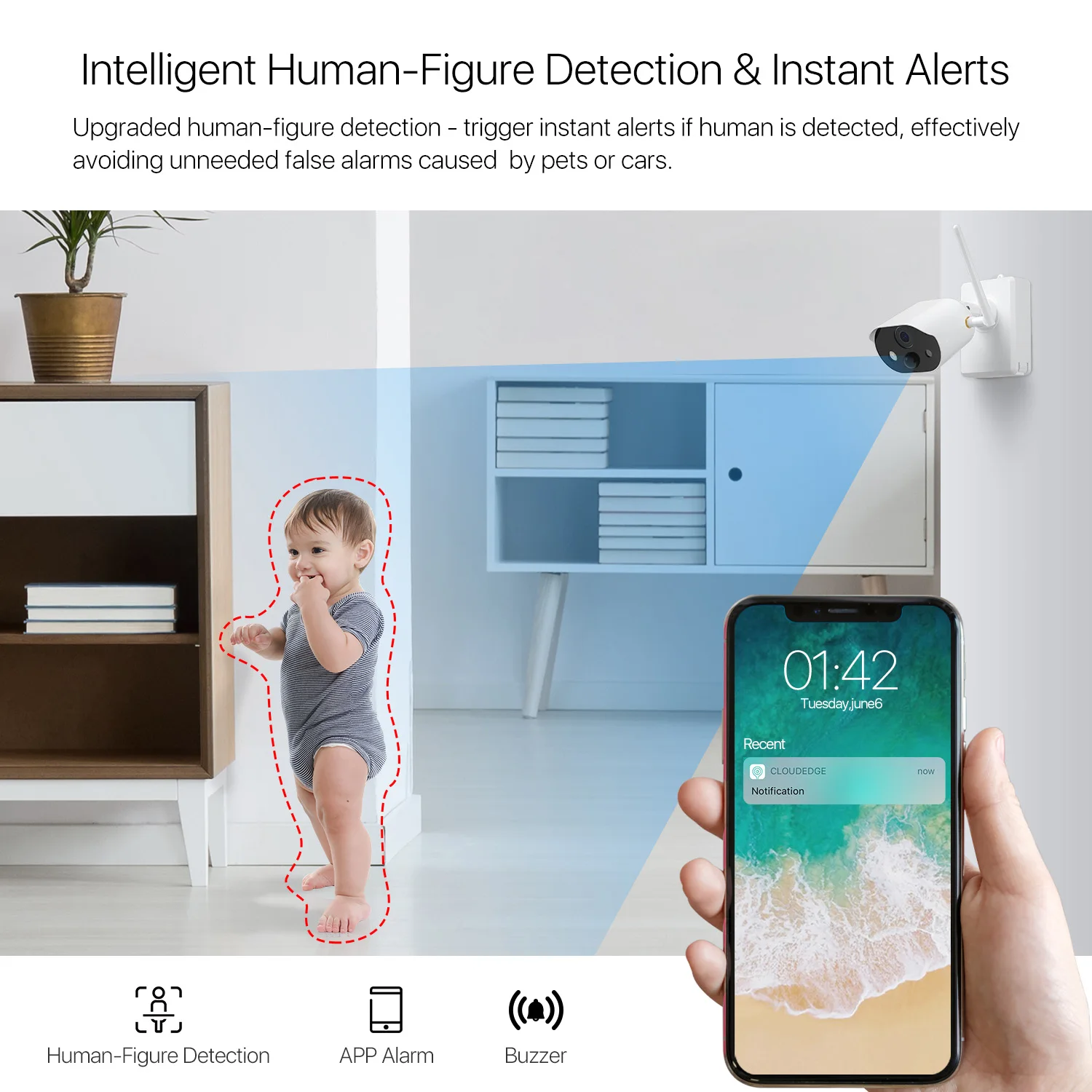 This innovative 1080P security camera offers a completely wire-free experience, allowing you to place it anywhere you need surveillance without the hassle of cords. Designed for easy installation, it is powered by a robust 7800mA rechargeable battery that is removable, ensuring long-lasting performance. The camera features two-way audio communication, allowing you to engage with visitors or deter intruders through sound. Equipped with PIR detection and human detection capabilities, it supports sound and light alarms to enhance security measures. With both SD card and cloud storage options, you can conveniently store and access your recordings. The battery lasts for 3-4 months on a single charge, even with frequent motion detection, making it an efficient choice for your security needs.