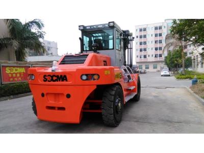 The Heavy Duty 18 Ton Diesel Forklift Truck in a striking red color is engineered for robust performance and efficiency. This powerful machine is equipped with a turbocharged engine that boasts low oil consumption while delivering exceptional torque and energy conservation, making it an environmentally friendly choice for heavy lifting tasks.