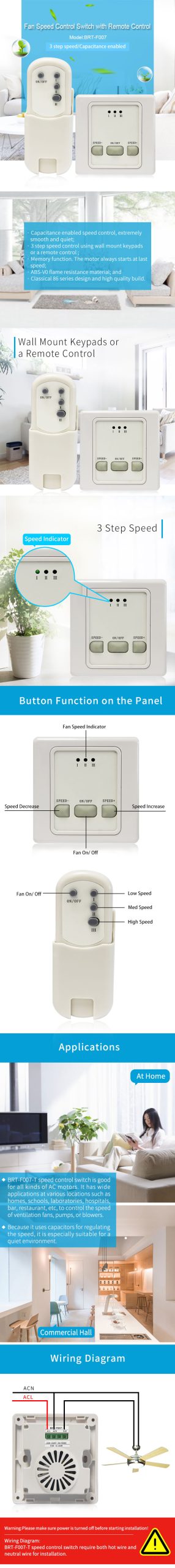 The BRT-F007-T is an innovative 3 Speed Capacitor Fan Control Remote Switch designed for ultimate convenience and efficiency in managing fan speed. This advanced control mechanism features a built-in microcontroller unit, enabling both precision and seamless operation. The package includes a wall-mounted keypad unit for fixed access and a handheld remote control for unmatched flexibility. The wall mount unit is engineered for easy installation, allowing it to retrofit directly into standard wall boxes.