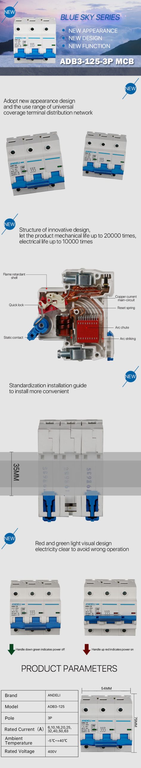 The ADB3-125 miniature circuit breaker is designed to enhance safety and performance in electrical systems. With a new appearance, innovative design, and advanced function, this breaker ensures reliable protection against overload and short-circuit conditions. Ideal for residential and commercial applications, it combines efficiency with modern aesthetics, making it a must-have for any electrical installation.