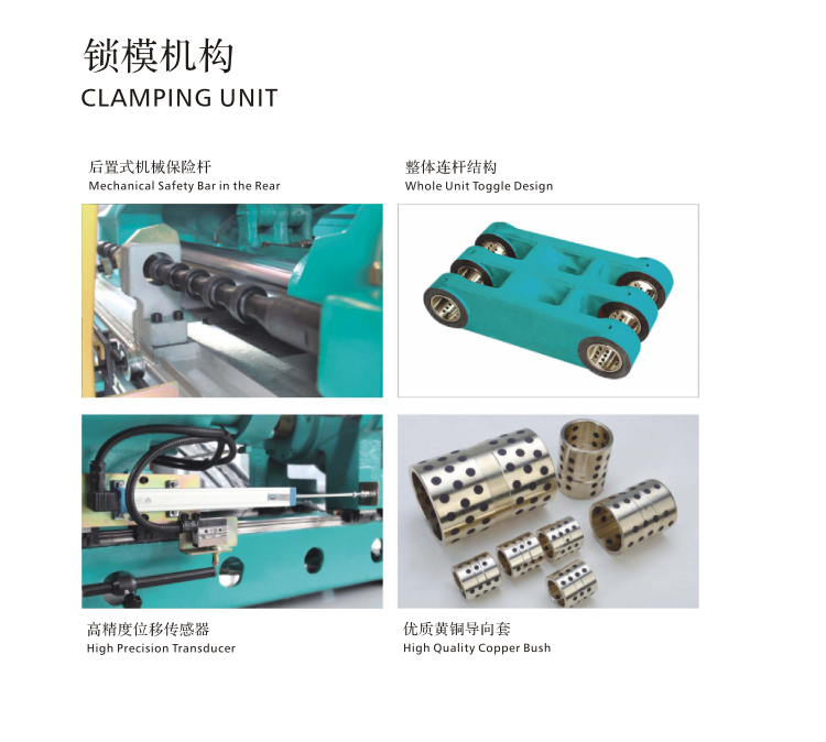 | Clamping Unit | Optimized platen design, Euromap-based layout, new ejection system with longer stroke, hydraulic-driven mold height adjustment. |