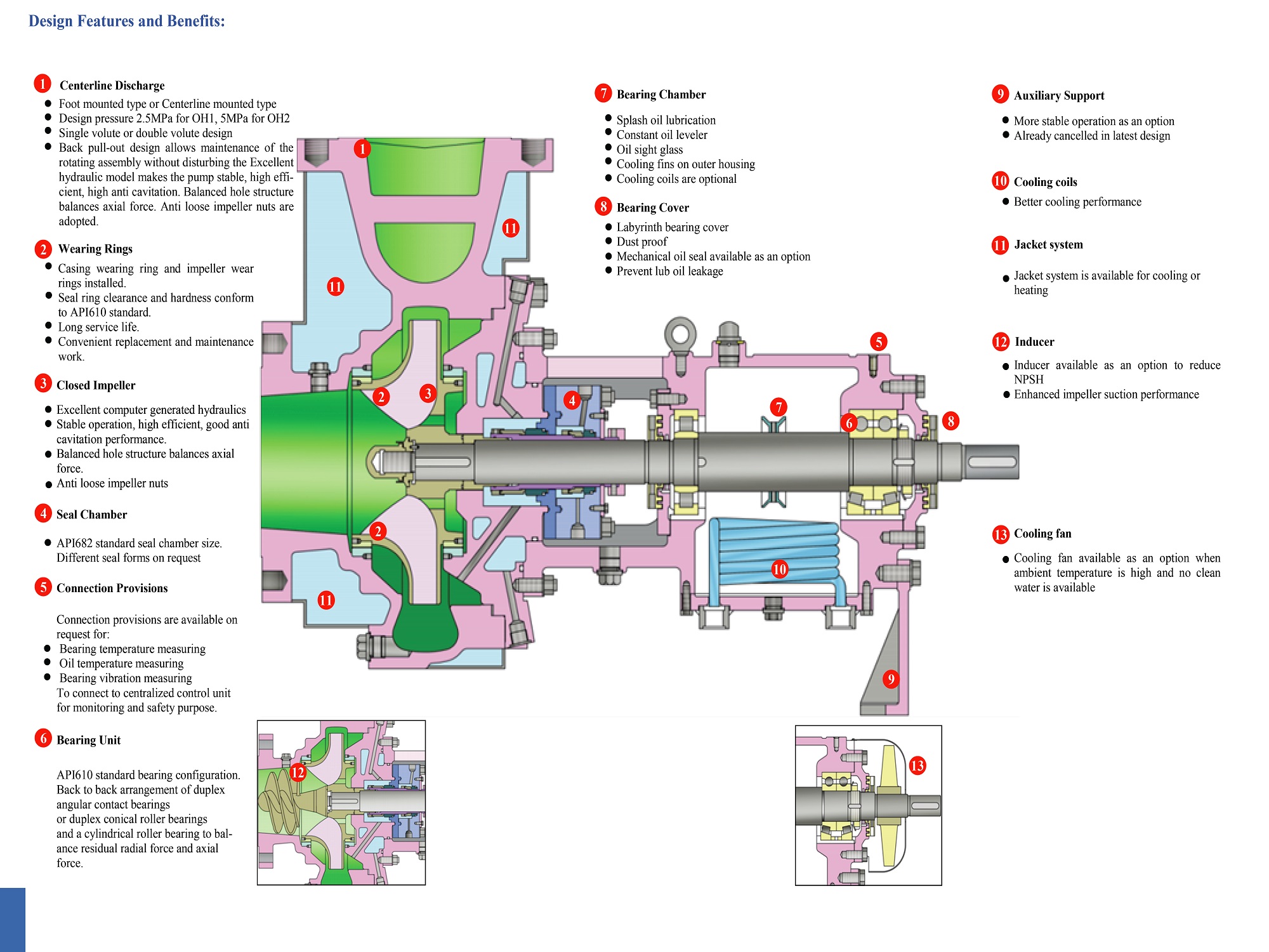 This pump is equipped with connection provisions for temperature measurement, vibration testing, and pressure testing, facilitating intelligent monitoring and improving overall reliability. The OH series offers diverse configuration types to optimize mechanical design based on unique working conditions, with sealing chambers and forms that comply with API standards.