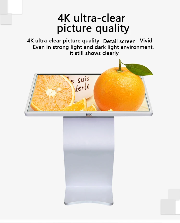 The BGC Kiosk Stand features a 55-inch infrared touch screen with a stunning 4K HD display, designed for interactive information service applications. Built to withstand demanding environments, its screen surface is waterproof, dustproof, scratch-proof, oil-proof, explosion-proof, and shockproof. The high transmittance toughened glass ensures superior visibility and durability. This kiosk supports smart touch operations, including full-screen handwriting and high click density, making it ideal for navigation and self-service business applications. Customization options are available for the machine shape and fuselage color, allowing it to blend seamlessly into any setting.
