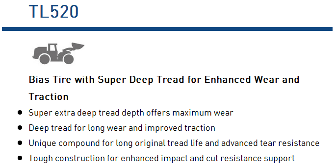 The Bias OTR-TL520 is designed for heavy-duty performance, featuring a super deep tread that enhances wear resistance and traction. Perfect for off-the-road applications, this tire provides robust durability and stability, making it an ideal choice for construction and agricultural machinery. Its design ensures optimal grip on various terrains, allowing for maximum efficiency and safety while operating in challenging environments.