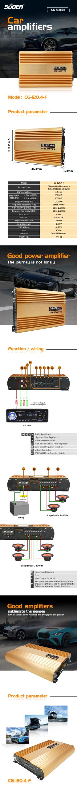The CG-120.4-F Full Frequency 4Channel 1500W Class AB Car Amplifier is designed for audiophiles seeking superior sound quality in their vehicles. This powerful amplifier delivers a robust 1500 watts of power, ensuring clear and dynamic audio performance across all frequencies. With its Class AB design, it combines the efficiency of Class A with the power of Class B, providing an exceptional listening experience. Whether you’re cruising down the highway or parked at a tailgate, this amplifier enhances your audio setup, making every note and beat resonate with clarity.