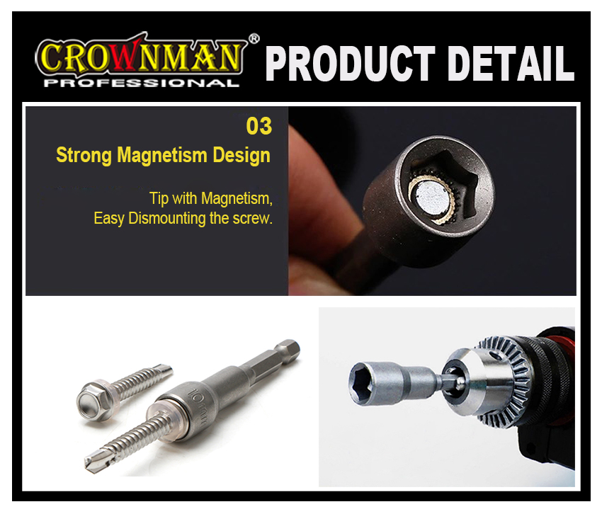 Equipped with strong magnetism, these nut setters securely hold nuts in place during installation, providing a reliable and effective work experience. Additionally, the unique card slot design in the socket tail ensures a robust connection that prevents disconnection during use. This set is an essential addition to any toolbox, making nut setting tasks quicker and more efficient.