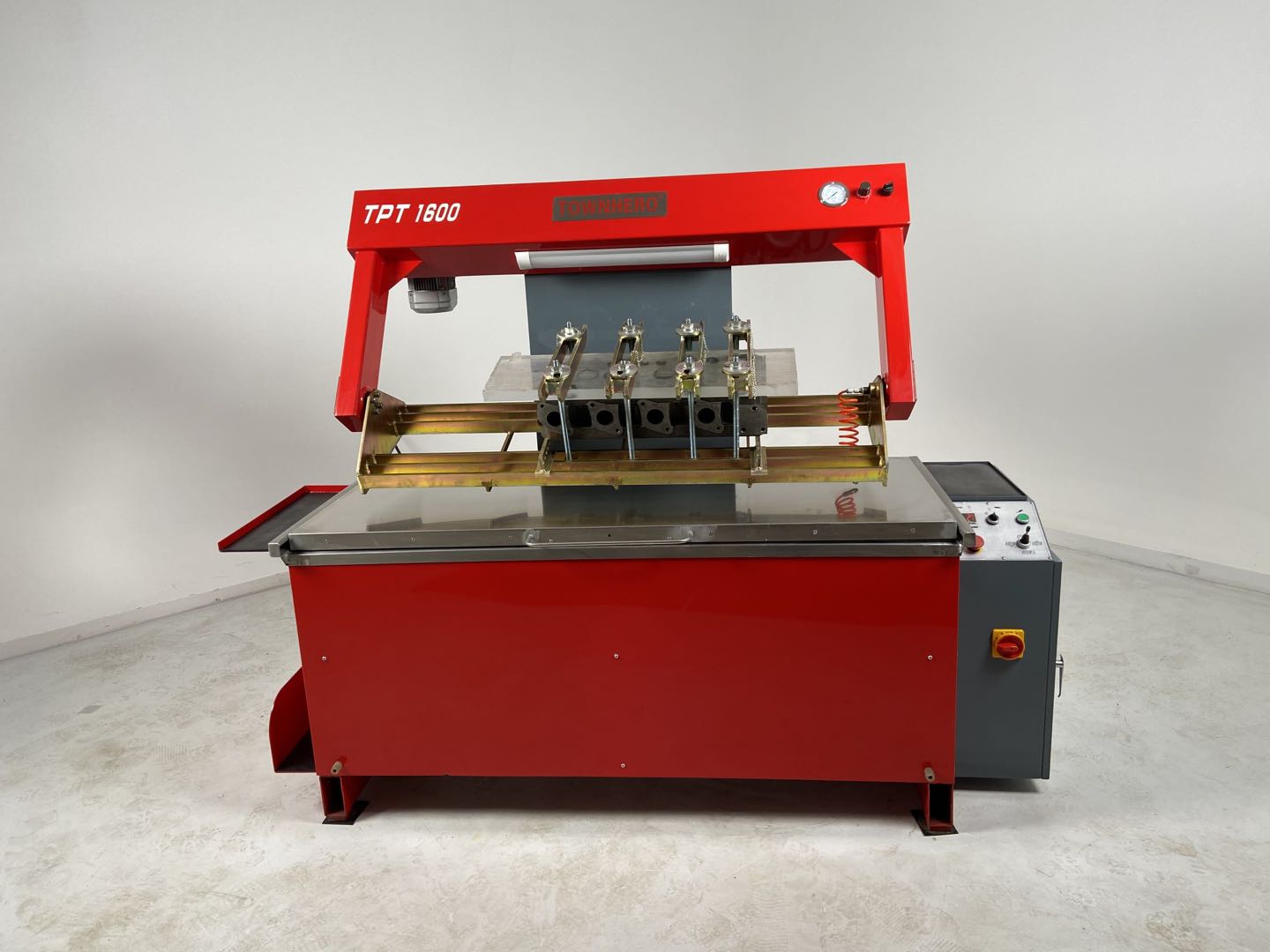 The Cylinder Head Pressure Tester is an advanced tool specifically designed to accurately test the pressure and temperature of cylinder heads and engines. This model, TPT1600, features enhanced usability through its updated design, making it easier to operate. The temperature is regulated by an electronic thermostat, ensuring precise readings during testing. Additionally, the workpiece is elevated using a hydraulic system, allowing for seamless handling. The device is equipped with a 360° roll-over fixture that is controlled by an electric system, enabling efficient and versatile operation. With high-efficiency heating elements integrated into the design, this tester is perfect for automotive professionals seeking reliability and performance in their tests.