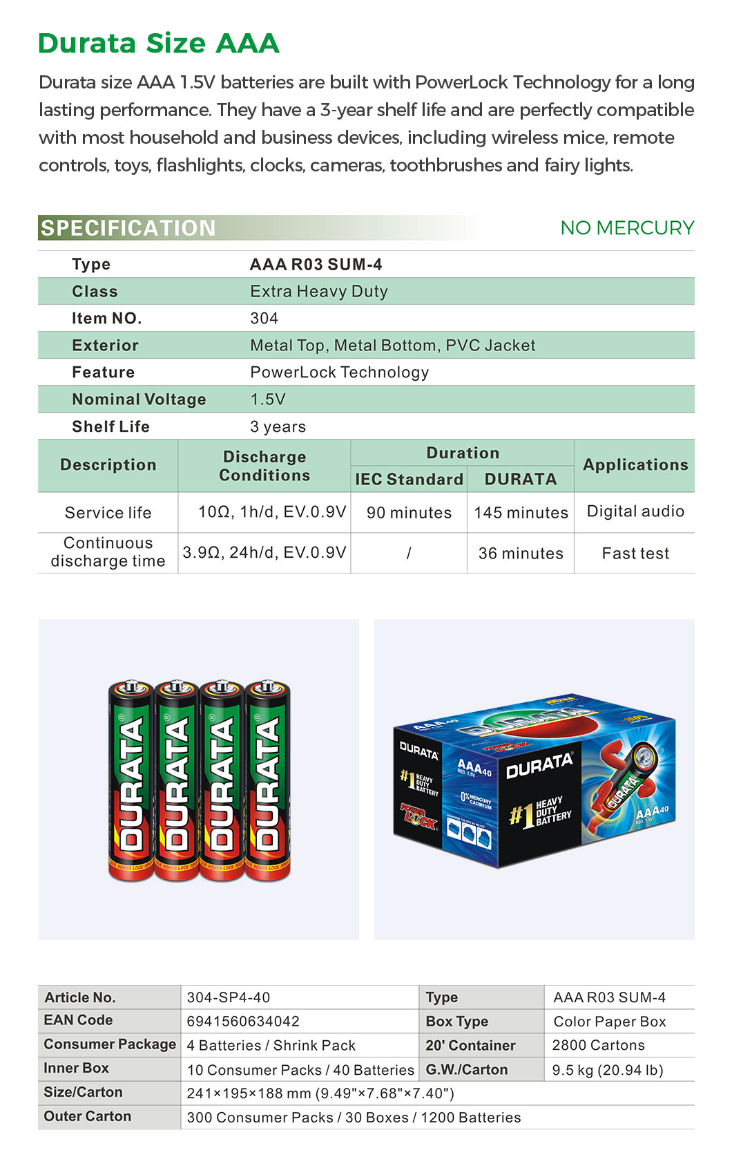 The Durata R03 AAA Size Extra Heavy Duty Zinc Carbon Dry Cell Battery is engineered for high performance and reliability. Ideal for powering a wide range of devices, including remote controls, toys, and flashlights, this battery ensures long-lasting energy to keep your essential gadgets running smoothly. Its extra heavy-duty formulation provides enhanced power output and stability, making it a superior choice for everyday use.