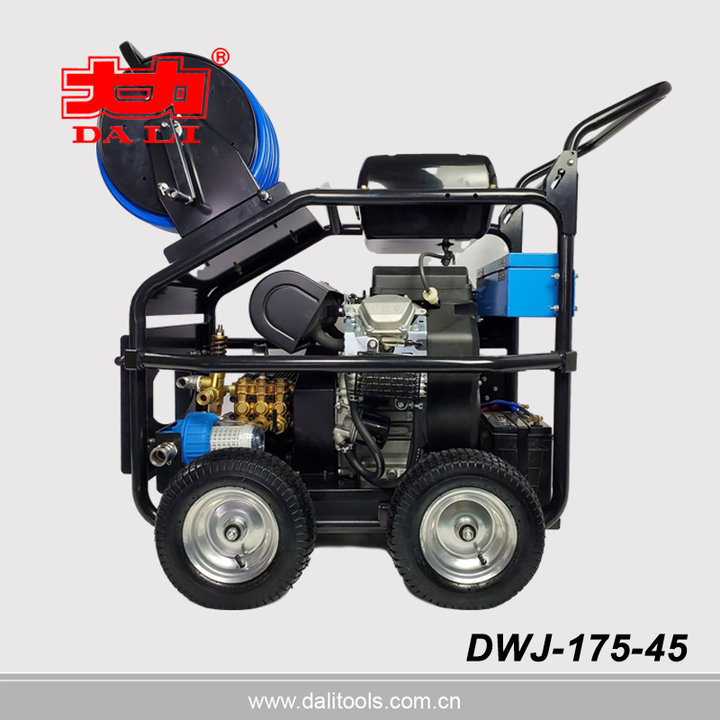 The DWJ-175/45 High-Pressure Water Jetting Machine is a powerful solution designed for efficient drain cleaning. Capable of handling drain lines from 50mm to 300mm (2” to 12”) in diameter and extending up to 60 meters (200 feet) long, this machine delivers an impressive working pressure of 2500 psi (172 bar) and a flow rate of 45 liters per minute (11.9 gpm). The standard kit includes a DALI Foot Pedal for enhanced safety, while the pulse feature assists in maneuvering the hose around tight bends and traps. Powered by a robust 16.3KW (22HP) gasoline engine, the DWJ-175/45 is engineered for both performance and reliability.