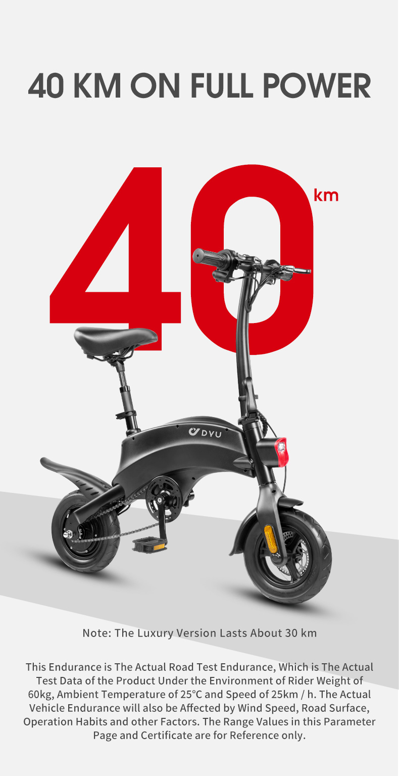 The DYU Smart Electric Bike S2 is a cutting-edge electric bike designed for urban commuting and leisure riding. Weighing only 15 kg, this bike boasts a lightweight and compact design that makes it easily portable and perfect for city dwellers. With a contemporary aesthetic and an array of powerful features, the S2 ensures a smooth and enjoyable ride. It offers a maximum speed of 25 km/h and a range of approximately 40 km, making it ideal for quick trips and daily errands. The bike also comes equipped with essential safety features, including front and rear lights, and reliable disc brakes for enhanced stopping power. Experience the freedom of electric mobility with the DYU Smart Electric Bike S2.