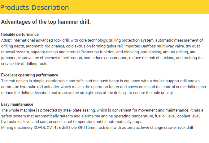 The Excavator Rock Drill XUVOL XVT45E is a cutting-edge solution designed for efficient rock drilling in demanding construction environments. Capable of drilling holes ranging from 89mm to 115mm, this versatile top hammer drill expands the functionality of excavators, offering an innovative alternative to traditional integrated drilling rigs. Its unique features include a full 360° rotation, a wide working radius, and exceptional off-road capabilities, ensuring high output and productivity in any terrain.
