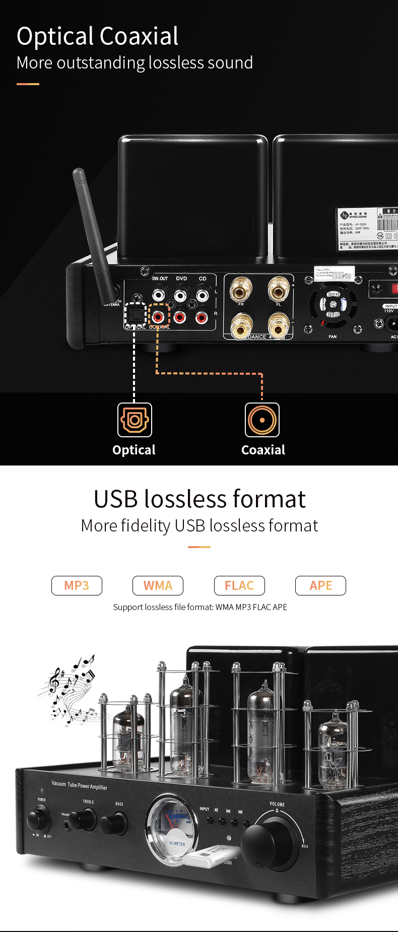 Experience superior sound quality with the HIFI Tube Amplifier and Speaker System, designed for home audio enthusiasts. This elegant system features an aluminum alloy panel, ensuring durability and a sleek aesthetic. The amplifier is equipped with a range of connectivity options including Bluetooth, USB, AUX, Optical, and Coaxial inputs, making it versatile for various audio devices. Enjoy precise audio control with the level meter signal display, bass, treble, and volume controls. For a complete audio experience, it includes a dedicated sub audio out for connecting an active subwoofer, delivering a powerful 30W per channel output.