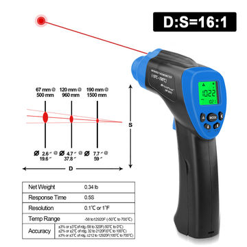 The HOLDPEAK HP-980D Measurement Instruments Digital Handheld Thermometer is an essential tool for precise temperature measurements across a wide range of applications. With an impressive temperature range of -58℉ to 1292℉ (-50℃ to 700℃), this thermometer delivers high accuracy readings of ±1℃/±1% in just 0.50 seconds, thanks to its adjustable emissivity feature.