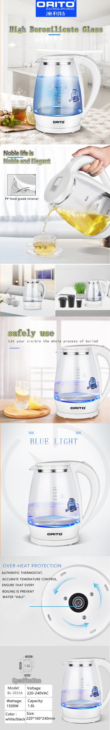 Experience the perfect blend of design and functionality with the Hot Sale 1.8L Tempered Glass Kettle. Crafted with a noble and elegant design, this kettle is made from food-grade explosion-proof glass, ensuring safety and durability. Its innovative PP material guarantees no unpleasant odors, making every boil a pleasant experience. The kettle features a 360° rotational base for cordless convenience, allowing you to serve hot water effortlessly. With a large capacity of 1.8L and a powerful 1500W heating element, it boils water quickly, taking just 3-6 minutes. Ideal for home kitchens, hotels, restaurants, dormitories, and apartments, this kettle is equipped with an automatic shut-off function for added safety.