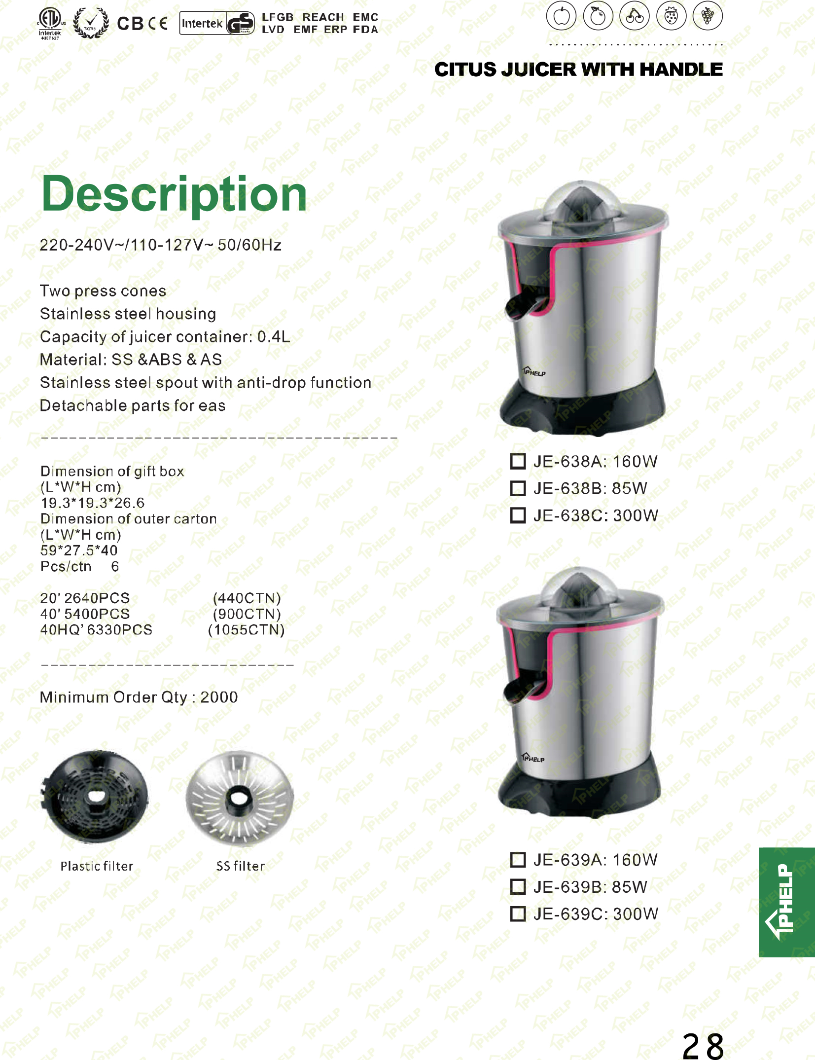 The JE-638 Citrus Juicer with Handle is an essential kitchen tool designed for effortless juicing of citrus fruits. Its ergonomic handle ensures a comfortable grip while maximizing juice extraction, making it ideal for both casual home cooks and culinary enthusiasts. Crafted from durable materials, this juicer not only enhances efficiency but also promises longevity, ensuring you can enjoy fresh juice for years to come. With its modern design, the JE-638 adds style to your kitchen counter while simplifying your juicing experience.