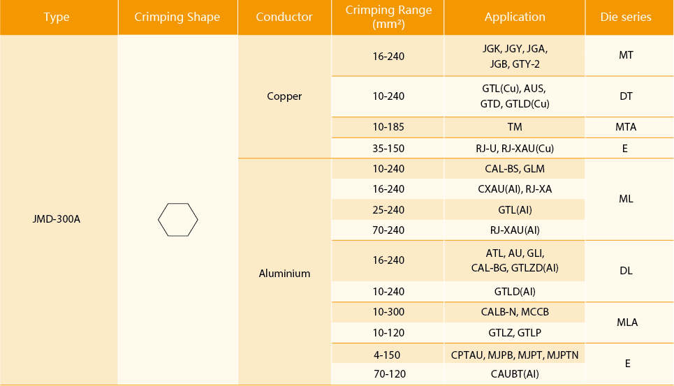 JMD-300A Battery Powered Hydraulic Crimping Tool is designed for efficient and convenient crimping of both copper and aluminum lugs and connectors. Its powerful hydraulic mechanism ensures a crimping force of up to 100kN, making it suitable for a wide range of applications. With an operating range of 16mm² to 300mm², this tool is perfect for both professional and DIY projects.