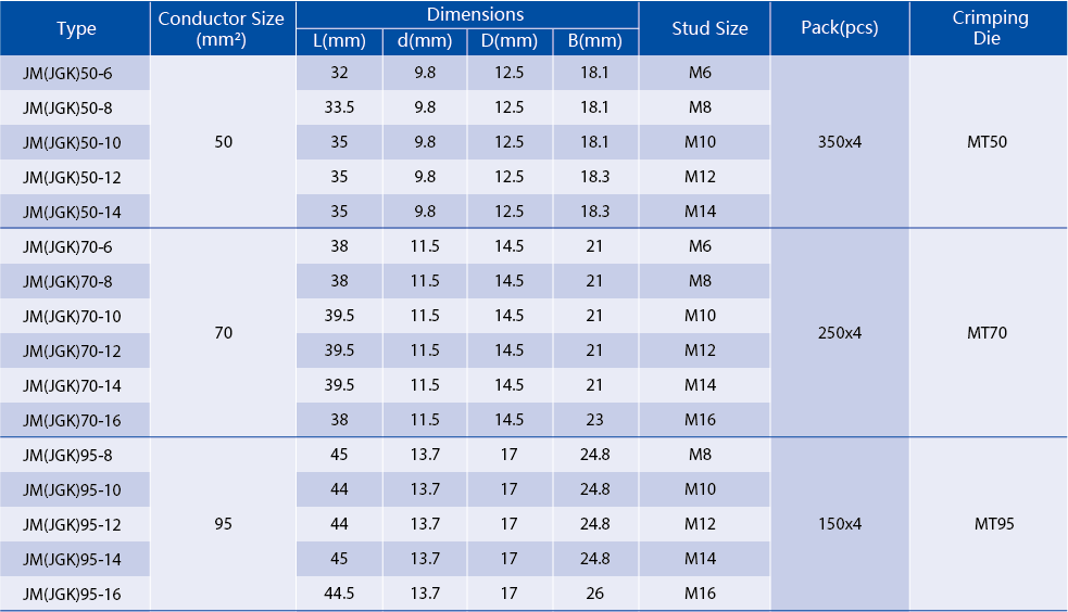 The JM(JGK) Cable Lug is an essential component designed for securely connecting copper cables to the copper ends of electrical equipment in low voltage applications. Crafted from high-quality materials, this cable lug ensures a reliable and efficient electrical connection. The lug features a unique arc-shaped viewing window on its bevel, allowing for easy inspection of the conductor’s position, enhancing user convenience and safety.