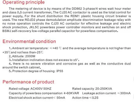 | Features | Automatic compensation, leakage protection, energy calculation, overcurrent protection, overvoltage protection, open-phase protection, electric larceny protection |