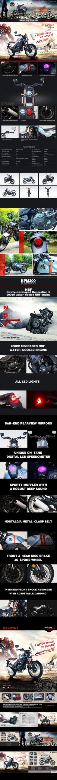 The KPM200 (LF200-3B) LIFAN Street Bike is a stylish and powerful 200cc motorcycle designed for urban commuting and leisure rides. With its sleek design and robust performance, this bike offers riders a thrilling experience on the road. The KPM200 is engineered for reliability and efficiency, making it the perfect choice for both new and seasoned riders. Its lightweight frame and agile handling ensure easy maneuverability, while the comfortable seating and modern features provide an enjoyable ride.