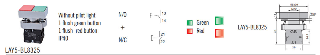Introducing the LAY5-BL8325, a robust and reliable double head push button on/off metal switch designed for effective circuit control in various electrical applications. This switch features a distinct red and green design, making it easy to identify its operational state. It is engineered for controlling circuits of AC voltage up to 660V at 50Hz or 60Hz, and DC voltage below 400V, making it suitable for a wide range of uses including signaling and interlocking purposes. Made from durable zinc alloy and high-quality anti-flame plastic, it ensures longevity and safety in operation. The switch also employs special silver alloy contacts to minimize electrical erosion, maximizing its lifespan and reliability.