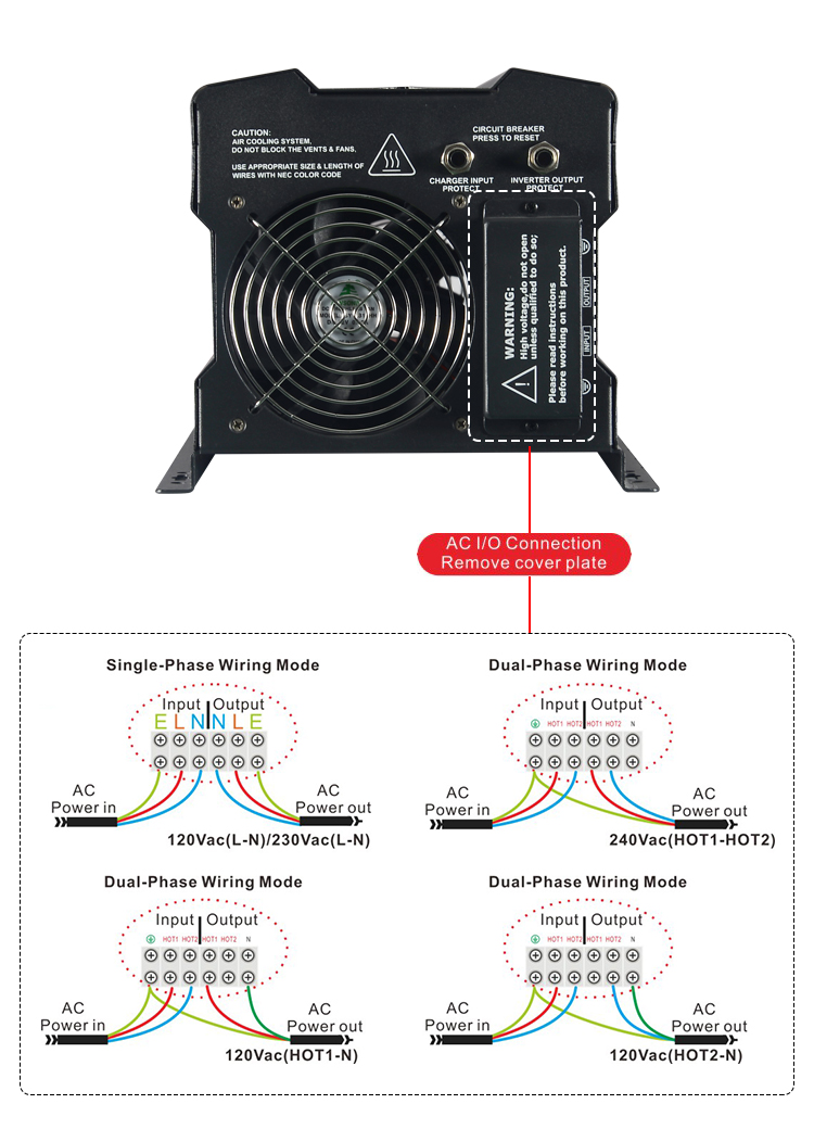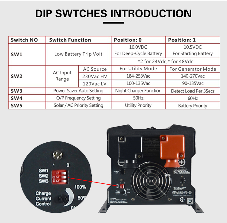 Low Battery Trip Voltage: Default set at 10.0VDC, customizable to 10.5VDC.