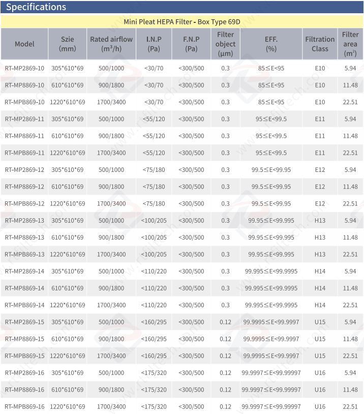 The Mini Pleat HEPA Filter is engineered for high-performance filtration in HVAC systems and clean rooms, ensuring superior air quality. With its large specific surface area and high dust capacity, this filter guarantees efficient dust removal while maintaining stable airflow. Designed to meet the stringent cleanliness requirements of modern environments, it features uniform pleat spacing and exceptional filtration efficiency. The filter operates with low resistance, making it suitable for various applications where water and moisture resistance is crucial. It can withstand temperatures up to 80°C and relative humidity levels of 100% RH.