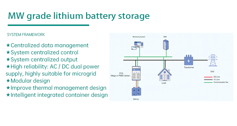 The MW grade lithium battery storage system offers a comprehensive energy storage solution that combines battery technology, Battery Management System (BMS), Power Conversion System (PCS), and Energy Management System (EMS). This integrated approach provides customized, one-stop energy storage solutions, ensuring efficiency and reliability in various applications.