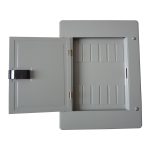This distribution box accepts GE type 1′ THQL breakers and is suitable for single-phase, three-wire systems with a rated current of up to 100A and service voltage of 120/240Vac. The wider enclosure promotes efficient heat dissipation, and it can be installed in either flush or surface-mounted configurations, catering to various installation requirements.