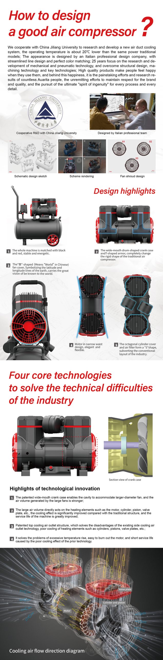 The Oil-Free Air Compressor 2-900F5 is a state-of-the-art solution for high-efficiency air supply needs. Designed by a talented Italian team, it features an elegant and modern industrial appearance, making it an ideal addition to any workshop or industrial setting. This compressor embodies the high standards and quality of the Auarita brand, which has been synonymous with excellence for over 25 years. As a national high-tech enterprise in China, Auarita focuses on continuous innovation and research in the pneumatic field, ensuring that this product meets the demands of today’s market.