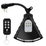 Outdoor Remote Control Outlets with Timer and Light Sensor is the perfect solution for controlling your outdoor lighting and decorations effortlessly. This innovative device, model no. BHC1804-RF-TL, features a photoelectric timer with a remote control that allows you to manage your outdoor lights and animated holiday decorations with just the push of a button from inside your home. The timer automatically activates at dusk and turns off at dawn, or you can program it to switch off 2, 4, 6, or 8 hours later according to your needs. With three grounded outlets and compatibility with CFL, LED, and incandescent lighting, this unit is designed for convenience and flexibility.
