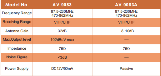 | Frequency Range | VHF: 87.5-230MHz, UHF: 470-862MHz |