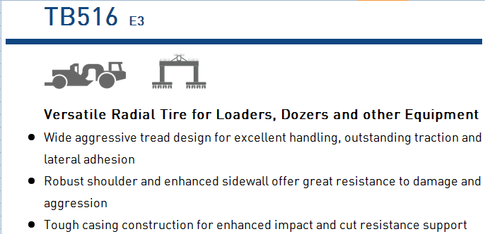 The Radial OTR-TB516 is a versatile radial tire designed specifically for heavy-duty loaders, dozers, and various types of industrial equipment. Engineered for optimal performance in challenging terrains, this tire ensures superior traction, stability, and durability, making it ideal for both construction and agricultural applications. With its robust construction and innovative tread design, the Radial OTR-TB516 provides excellent resistance to wear and tear, guaranteeing a long service life and enhanced productivity on the job site.