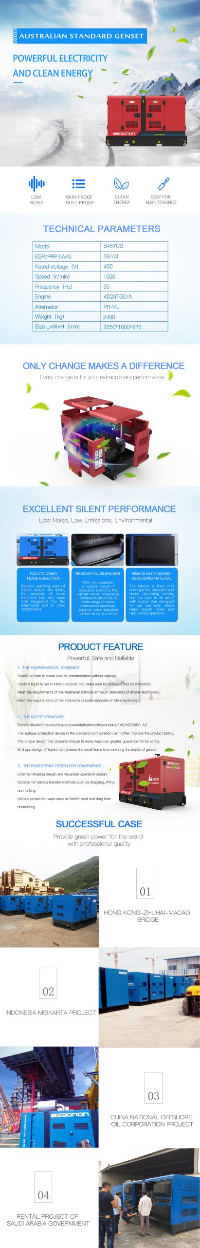 The SAONON Australian Standard Genset is a high-performance generator designed to meet the rigorous demands of both residential and commercial applications. Engineered for reliability and efficiency, this genset complies with Australian standards, ensuring safety and performance. It features advanced technology for optimal fuel consumption and noise reduction, making it an ideal choice for users seeking sustainable power solutions. Whether you need backup power during outages or a reliable energy source for outdoor events, the SAONON Genset delivers unparalleled performance and peace of mind.