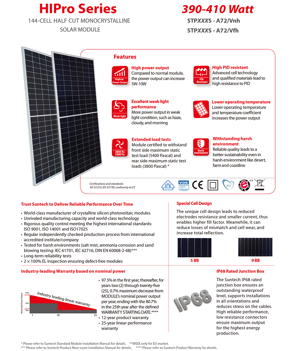 The Suntech Solar 144 cells 395W Half Cut Mono Solar Panel is designed for high-performance solar energy solutions. This advanced PV module boasts a power range of 395W to 400W, making it an ideal choice for various solar systems aiming for efficiency and reliability. Utilizing cutting-edge half-cut cell technology, this panel enhances energy yield while reducing shading losses, ensuring optimal performance even in challenging conditions. Durable and efficient, it is perfect for both residential and commercial applications.