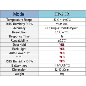 For optimal performance, ensure that the device is stored in a dry environment and that the batteries are replaced as needed. The HP-2GR is suitable for both professional and personal use, making it a reliable choice for anyone needing accurate temperature and humidity monitoring.