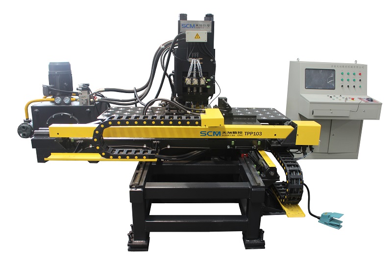 The TPP103 CNC Plate Punching Machine is a specialized tool designed for the efficient punching and marking of steel plates, primarily for the steel tower industry but also applicable to various other fields. Its robust construction features a C-type plate welding frame, ensuring optimal rigidity and a spacious handling area, catering to various workpiece sizes.