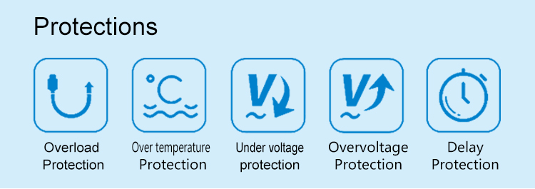 | Protection | Low Voltage | Over Voltage | Time Delay | Overload/Short Circuit | Efficiency |