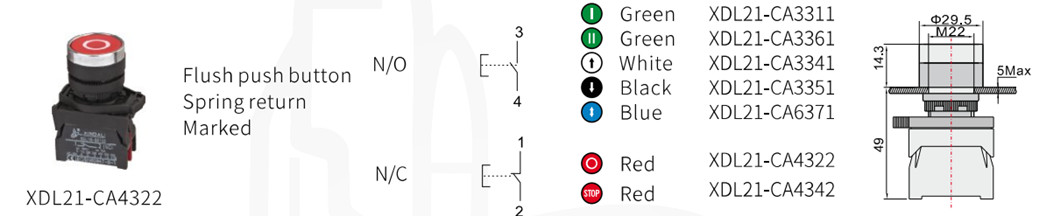 Introducing the XDL21-CA4322 waterproof red button head push button switch, designed for robust performance in various electrical applications. This switch is perfect for controlling circuits with AC voltage up to 660V/AC50Hz or 60Hz, and DC voltage below 400V. Engineered with a main body made from durable zinc alloy and high-grade anti-flame plastic, it ensures longevity and safety. The special silver alloy used in the contacts enhances resistance against electrical erosion, making it a reliable choice for interlocking purposes and signaling. This product is also compatible with electrical appliances operating at AC voltage up to 380V/50Hz and DC voltage below 380V, making it ideal for indication, warning, and emergency signals. The XDL21-CA4322 meets GB/T14048.1 and IEC60947-5-1 standards, and is CE, ISO9001, ROHS, and UL certified for quality assurance.
