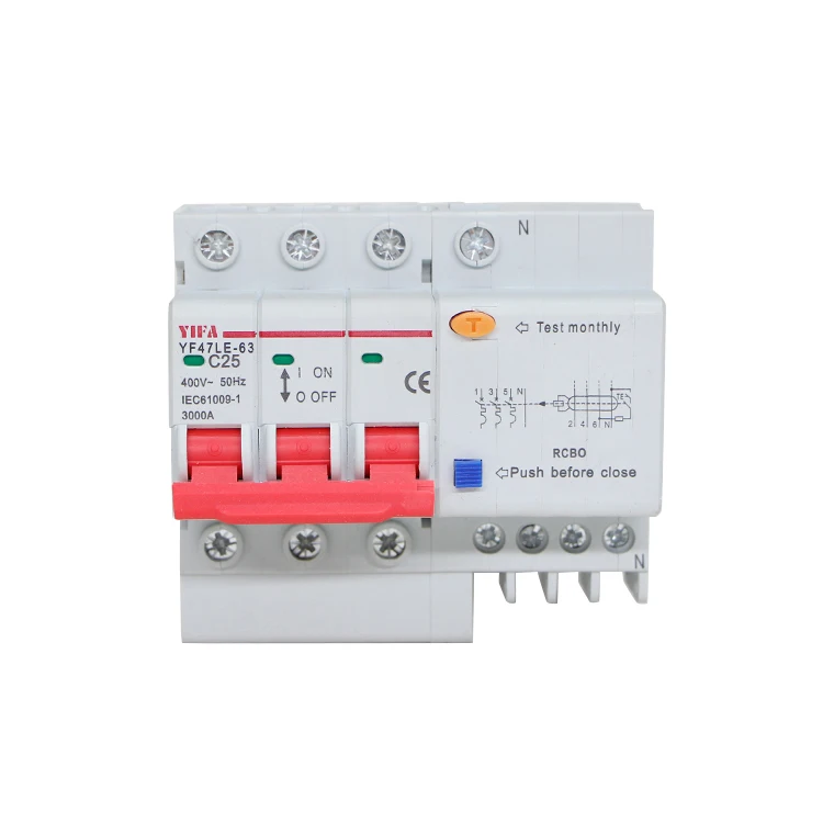 The YIFA Leakage Circuit Breaker RCBO (Residual Current Circuit Breaker with Overcurrent protection) is a crucial safety device designed to protect against electrical shock, overloads, and short circuits. This state-of-the-art product complies with the IEC61009-1 standard and is engineered to enhance user safety by also offering options for overvoltage protection based on individual needs. Specifically, the YF47LE-63 series operates effectively at an AC frequency of 50Hz with a rated voltage of 400V and is available in rated currents of 32A and 50A.